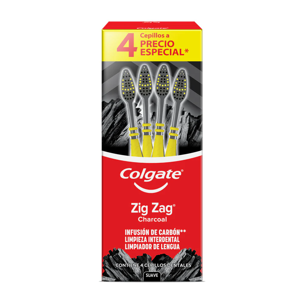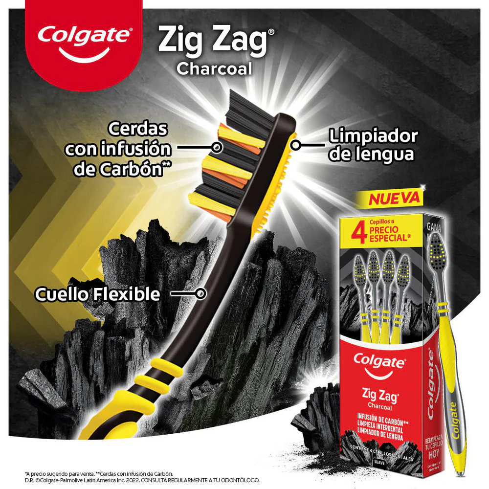 Remueve las bacterias que muchas veces ocasionan el mal aliento con el Cepillo de Dientes Zig Zag Charcoal de Colgate con presentación de 4 piezas con un empaque exhibidor. Recuerda que se recomienda almacenar el cepillo en posición vertical y permitir que se seque al aire libre lejos de otros cepillos dentales para evitar la contaminación cruzada.