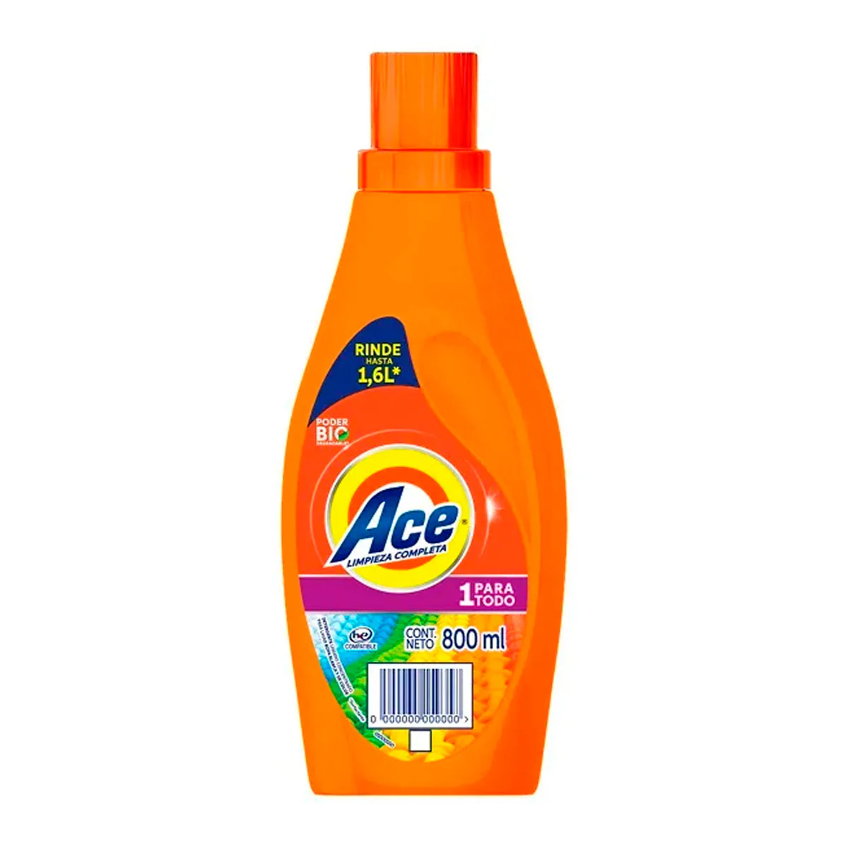 Detergente Liquido Ace Uno Para Todo De 800 Mililitros. Es Un Detergente Líquido Que Tiene Una Formula Especialmente Diseñada Para Remover La Mugre En Ropa Blanca Como En La Ropa De Color. Su Fórmula Con Bloques De Tecnología Actúan Removiendo Mugre Y Manchas, Dejando Así Los Blancos Y Colores Increíbles En Cada Lavada. Permite Pretratar Para Mejor Remoción De Manchas Y No Deja Residuos Visibles En Tu Ropa.